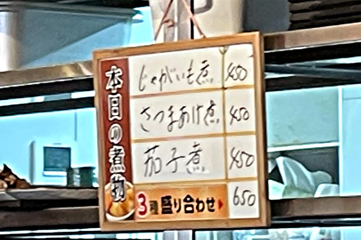 特に要チェックなのが、小さな「本日の煮物」のボード。写真を無理やり拡大してみるとこう。
