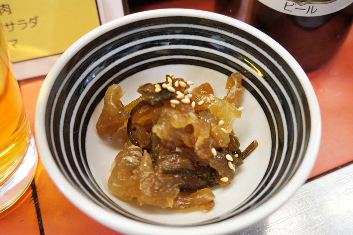 お隣になった常連さんがとてもフレンドリーで、おすすめをあれこれ教えてくれたので、そのあたりを中心にチョイス。「鯛塩昆布和え」(495円)、「クリームチーズの醤油漬け」(440円)。どちらも非常に優秀としか言えない酒のつまみ。