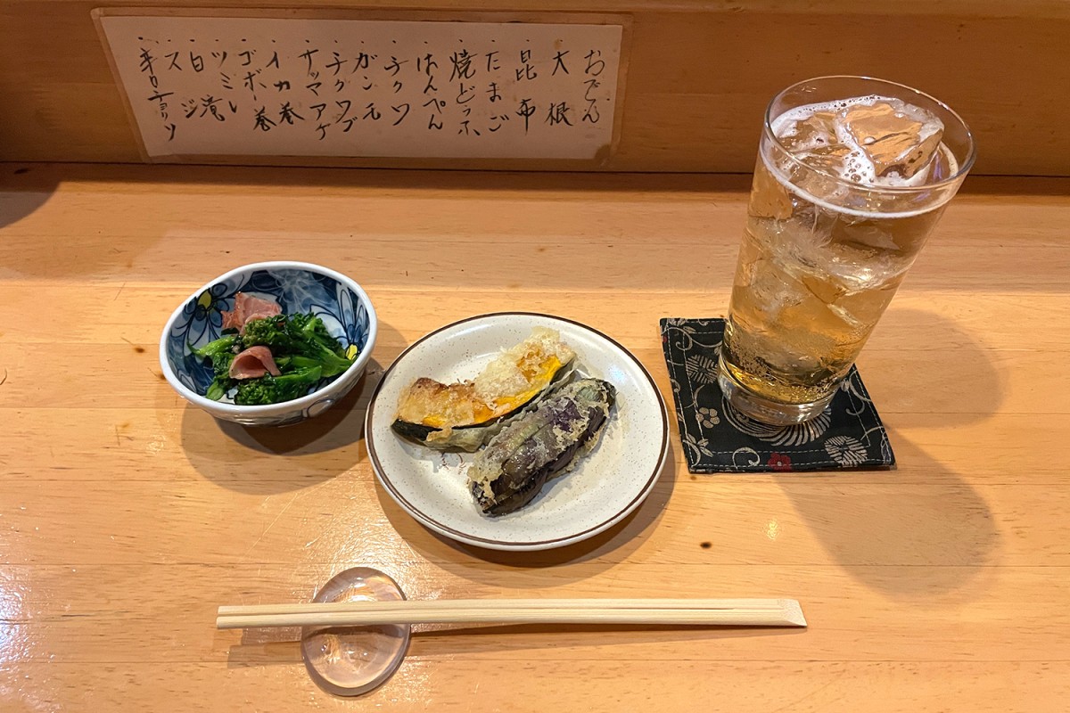 おでんがメインの店のようだが、カウンター上にいくつかのおばんざいもある。お腹はそんなに空いていない由を伝えると、そこからみつくろって出してもらったのが、なすとかぼちゃの天ぷら。菜の花とベーコンの炒めもの。