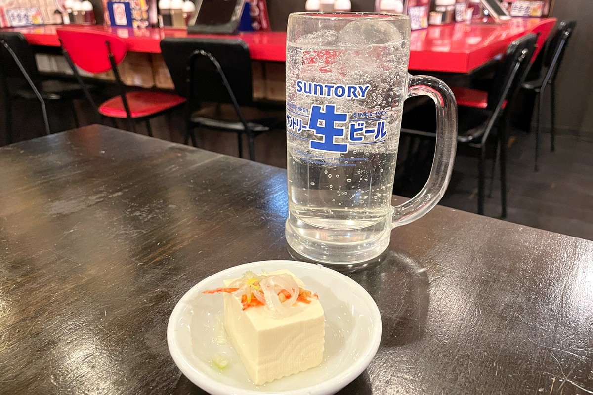 ホッピーセットをいきたかったけど、自動的にナカをおかわりすることになり、それは時間的に微妙かもしれないと、「プレーン酎ハイ」(税込420円)を。お通しはシンプルな冷奴だが、干した小海老がのっていてその風味がいい。