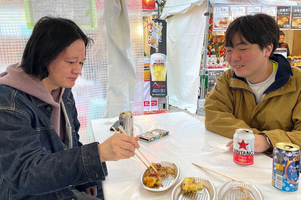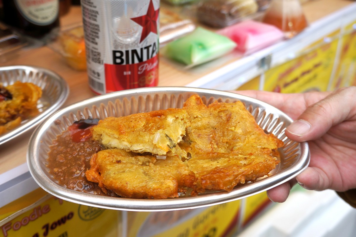 端から端までひととおりを眺め、特に気になったのが、小岩にあるインドネシア、ジャワの料理店「Wrang Wong Jowo」の屋台。他はどこも観光地的価格なのに対し、ここだけはジャワ風の天ぷらが1皿300円、「ビンタン」ビールが1缶500円とリーズナブルだ。なにより、天ぷらと言いつつなじみのない見た目の料理の味がとても気になる。