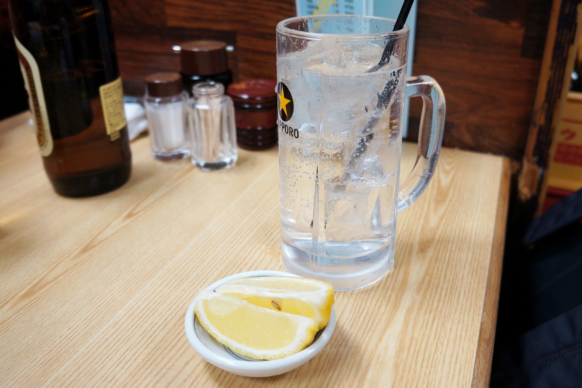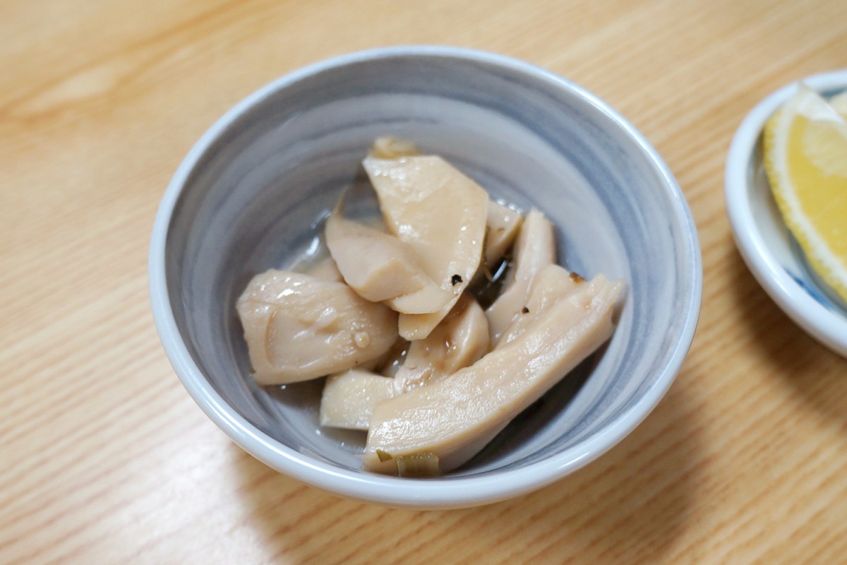 お通しは煮たエリンギに塩気とこしょうを利かせたもの? 独特だがこだわりを感じうまい。レモンサワーもなんだか風格があって良い。