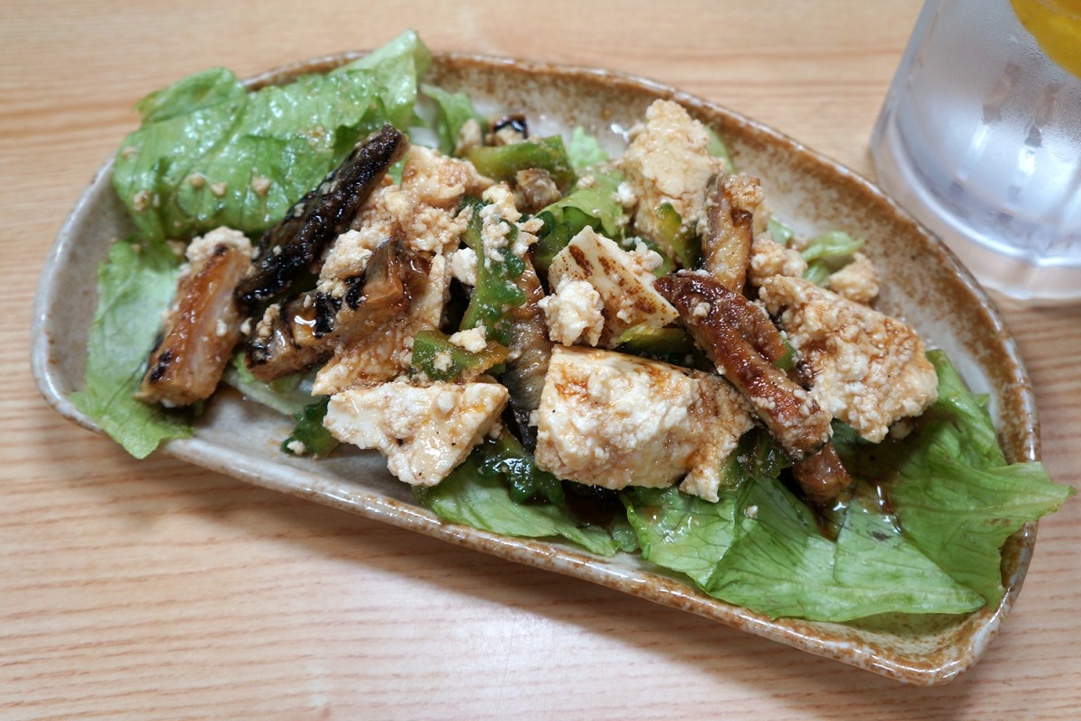 気になる冷製うなぎチャンプルは、ゴーヤーと豆腐入りの沖縄風チャンプルーに鰻の細切れが加わり、それをよく冷やしたもの。誕生した経緯の不思議さも含めて独特としか言いようがない。燗酒のほうが合ったかもな。