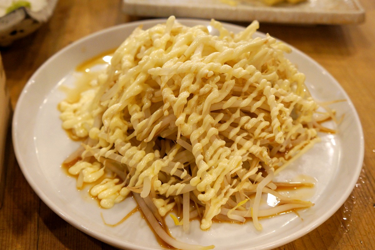 なかでも僕が感動したおつまみが、350円という最安ゾーンの「もやしマヨ」。醤油ベースで味つけられた大量のゆで(?)もやしにこれでもかとマヨネーズがかけてあるだけなんだけど、これが妙にうまい。作りかた、教えてもらいたいな。