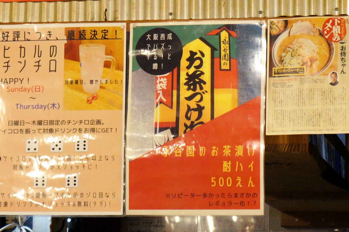 さらに変わったお酒も発見。なんと、「永谷園のお茶漬け酎ハイ」。どんなものかはわからないけど、とりあえず、永谷園のお茶漬けのもとを使ったチューハイであることは想像できる。西成でバズってると書いてあるけど、本当かな? こんなおもしろそうなメニュー、見つけてしまった以上頼まないわけにはいかない。