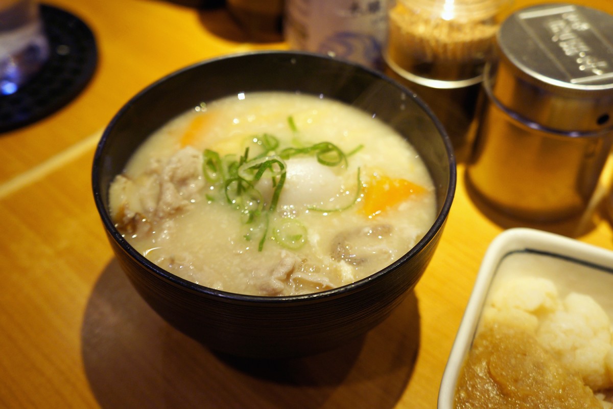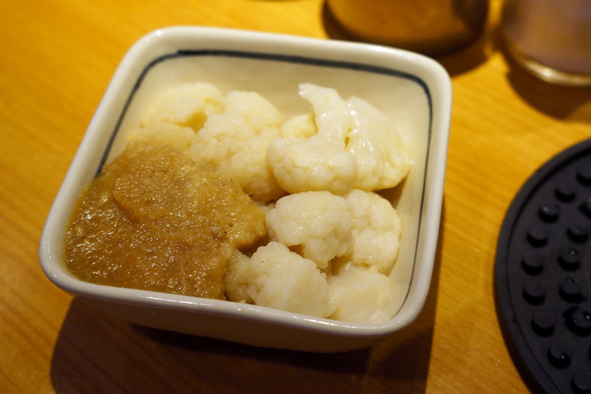 カリフラワーに添えられた自家製の肉みそが、それだけでずっと酒を飲めるほどに良いつまみ。自家製だれと豚の背脂で味つけたというもやしが、失礼ながらもやしとは思えない味わい深さ。とん汁と融合したかのような粕汁もうまぎる。