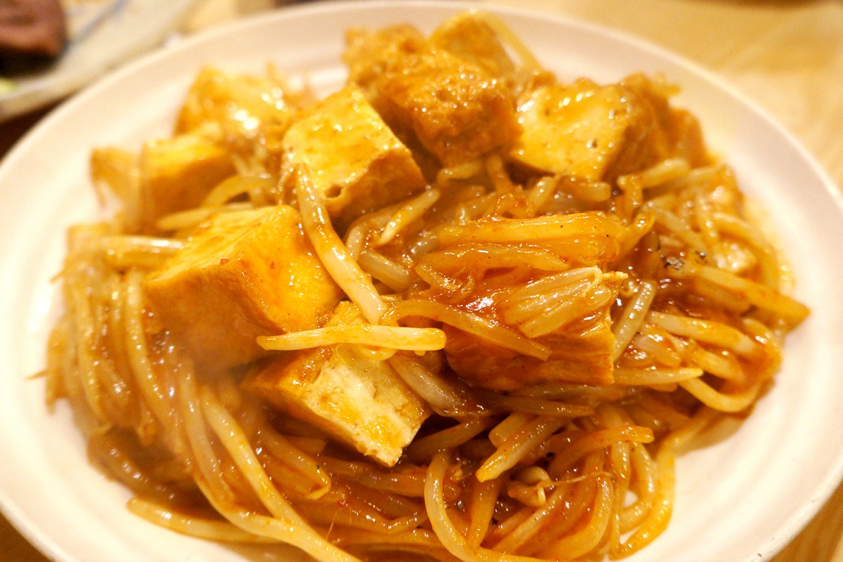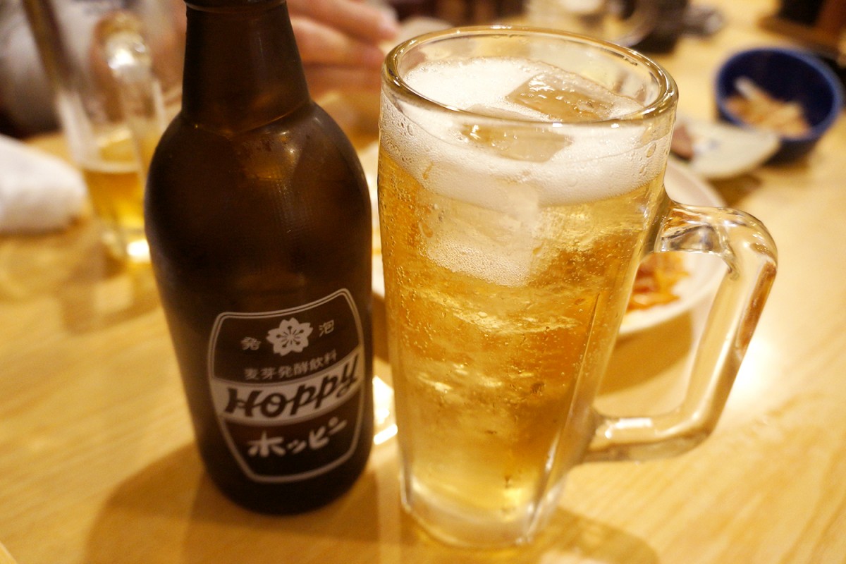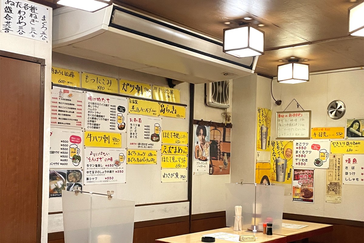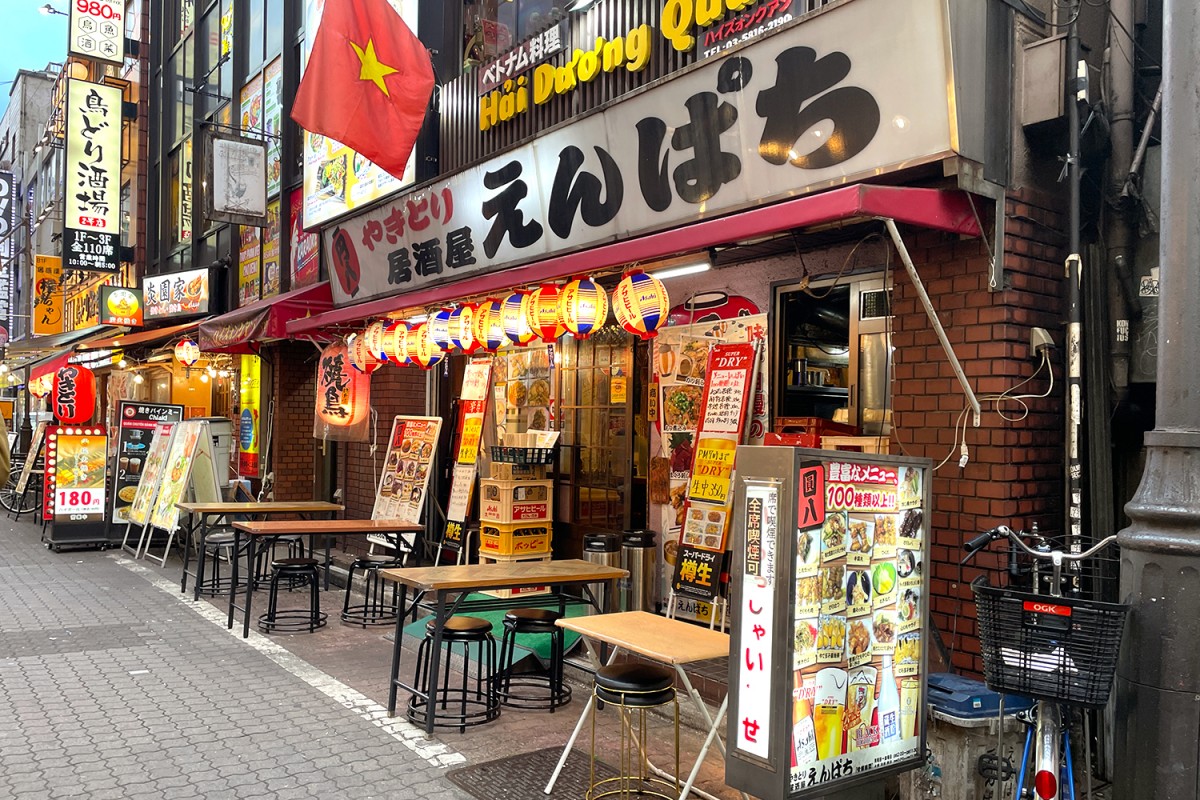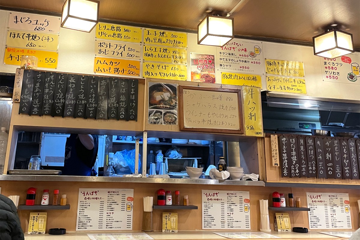 いろんなスパイスを使って味つけし、じっくり蒸したというえんぱち名物の牛タンは、ジャーキーのような不思議な食感で酒がすすむ。島らっきょうは当然うまい。厚揚げともやしの炒めは、唐辛子の辛味を利かせた甘辛味で、ボリュームたっぷりなのが嬉しい。けっきょく最後までこの3品をつまみに、ホッピーの「セット」(528円)、「中身」(220円)、「酎ハイ 酎五郎」(385円)と、がぶがぶと杯を重ねてしまったのだった。