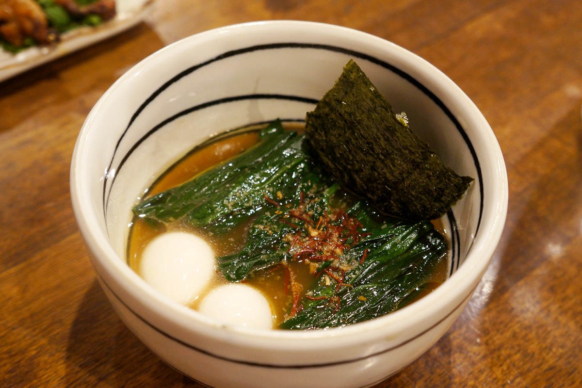 とても勉強になったのが家系ほうれん草。家系ラーメン風のスープにおなじみのトッピングであるうずら玉子と海苔、それからきれいに整えられたほうれん草。つまりラーメンの麺抜きというわけだけど、これがとても良いつまみになる。