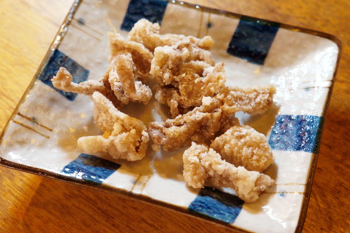 続いて、メニューに「当店の目玉商品」とある「酎ハイ」(250円)と「鶏皮せんべい」(100円)をセットで。