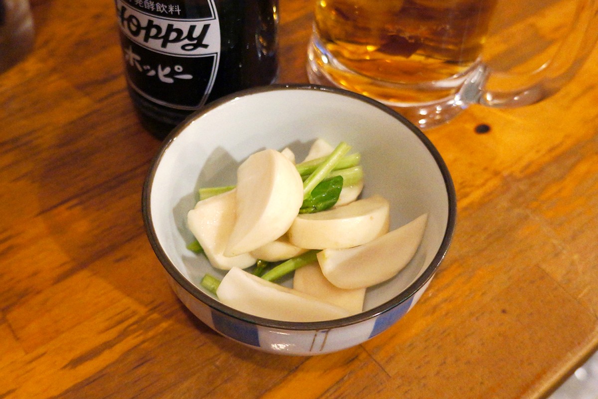 日替わりのボードから「かぶの浅漬け」(250円)、レギュラーメニューから「揚げ・にんにく」(150円)をもらう。