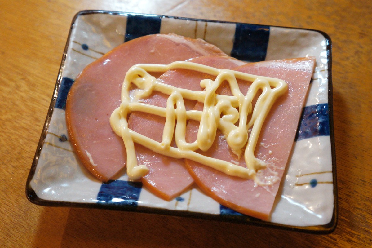 やがて小玉さんが合流し、立ち飲みからテーブル席に移動して引き続き飲む。発見だったのは「ハム・マヨ」(100円)で、切ったハムにマヨネーズを雑にかけただけのあまりにも素っ気ない一品ながら、これが妙にうまいのだった。